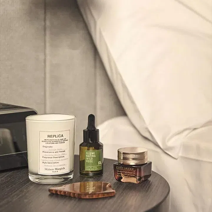 Products featured (left to right): Maison Margiela Replica Bubble Bath Candle, $105; Fields of Yarrow Oil and Gua Sha Set, $145; Estee Lauder Advanced Night Repair Eye Supercharged Gel-Creme Synchronized Multi-Recovery, $123