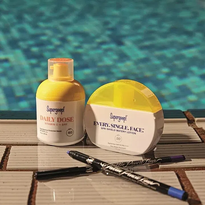 Products featured (left to right): Supergoop! Daily Dose Vitamin C + SPF40 Serum, $76; Supergoop! Every Single Face SPR-Shield watery lotion SPF 50, $56; KVD Beauty Tattoo Pencil Liner, $33