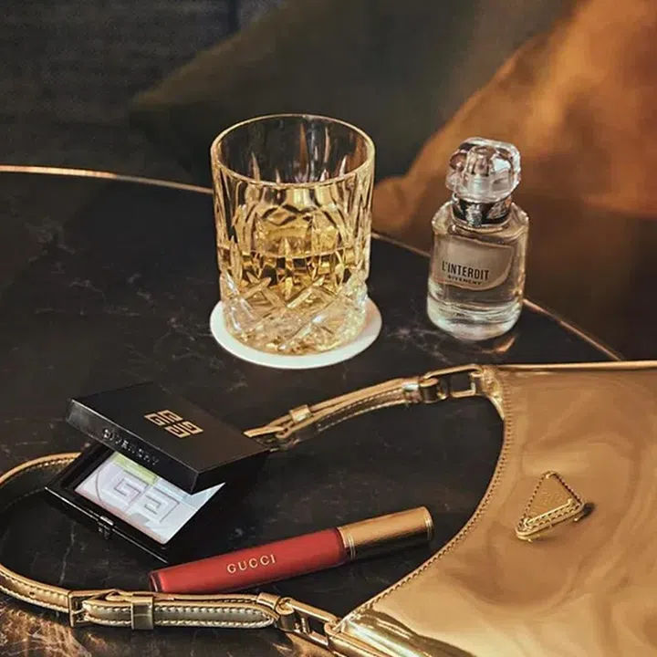 Products featured (left to right): Givenchy Prisme Libre Pressed Powder, $87; Gucci Rouge A Levres Liquide Mat Lip Colour in Goldie Red, $60; Givenchy L’Interdit Eau De Toilette, from $109
