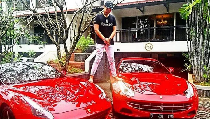 In one picture, he is standing astride two red Ferraris.