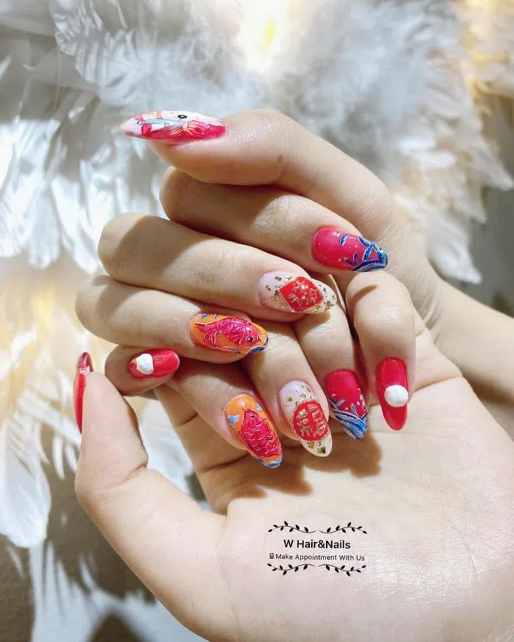 Want to really deck your nails out this CNY? W Hair & Nails has this set that is a full-on auspicious design. With koi fish, rabbits, and two Chinese characters, this nail art embodies the spirit of freedom and vitality going into the new year.