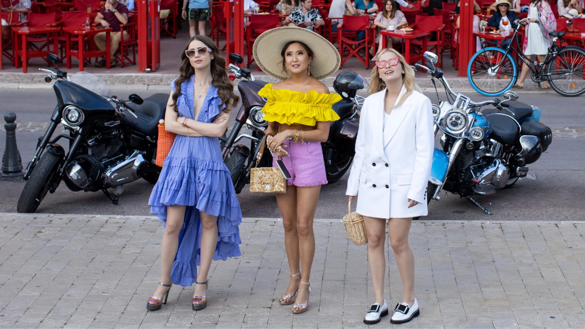 From left: Lily Collins as Emily, Ashley Park as Mindy, Camille Razat as Camille in episode 202 of Emily in Paris. Image credit: Carole Bethuel/Netflix © 2021