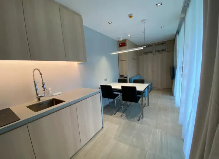 The 40-foot container houses a living area with a table and chairs as well as a kitchenette with a microwave oven and a bar fridge.