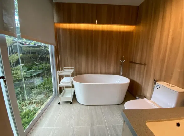With warm wood furnishings and a minimalist vibe, the bathroom affords views of the greenery outside while you enjoy a leisurely soak in the bathtub. And since the exteriors are mirrored, you won't have to worry about privacy concerns.