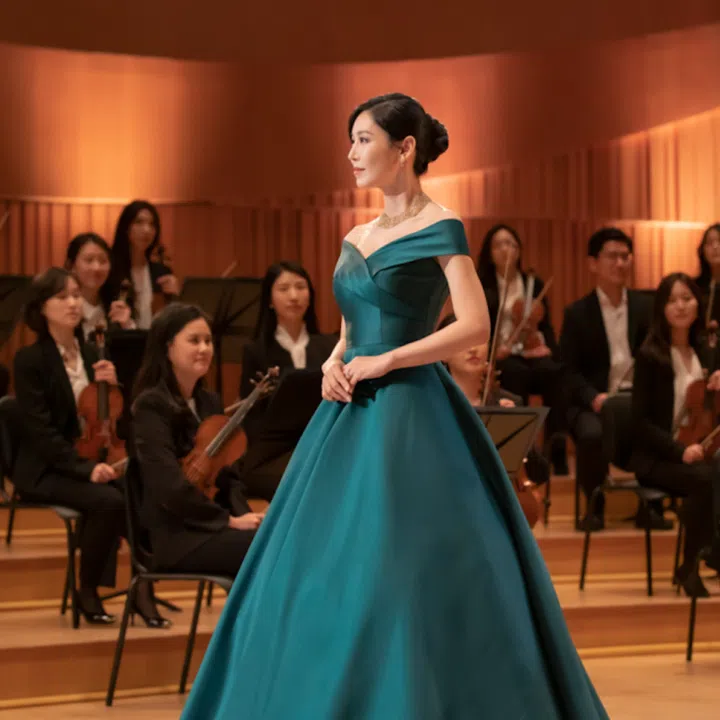 Playing a character who is a renowned soprano singer, Kim So-yeon donned a teal off-shoulder gown from Korean label Phoebe Dress when she performed.
