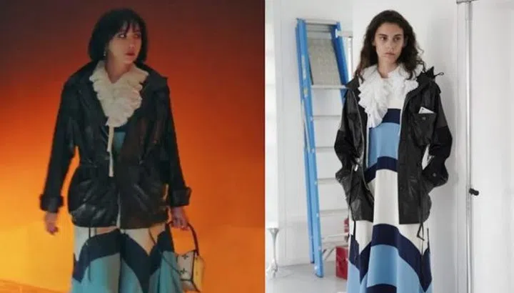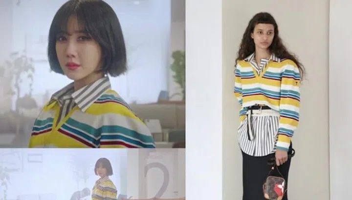 The styling of the new character Na Ae-kyo is punchier to show off her personality. One example is this Louis Vuitton pre-spring 2021 outfit that played with horizontal and vertical stripes, with the top set against a soft mermaid-tail maxi skirt.