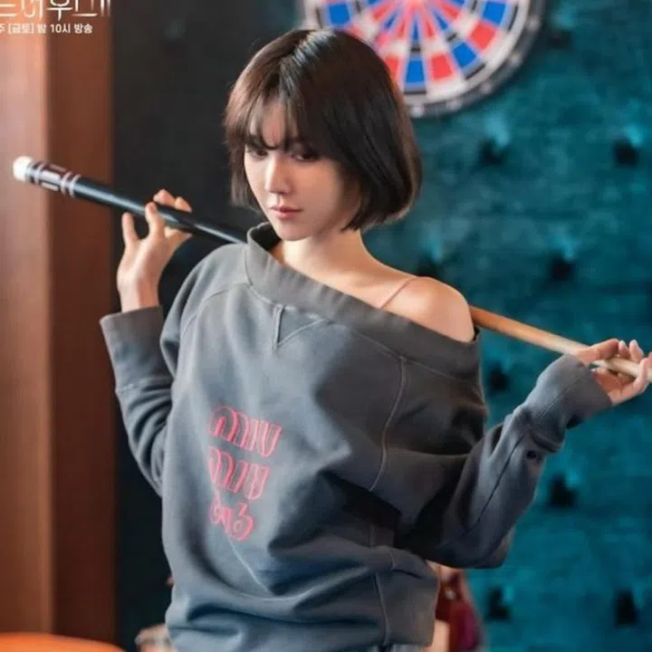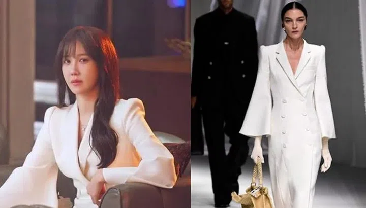 In the second season, Shim Su-ryeon made a dramatic return with a new identity as Na Ae-kyo. Her styling reflected her change and showed off a more cool, suave attitude. Here, she sported a Miu Miu pre-spring 2021 shoulder-baring top with grey trousers for a casual look.