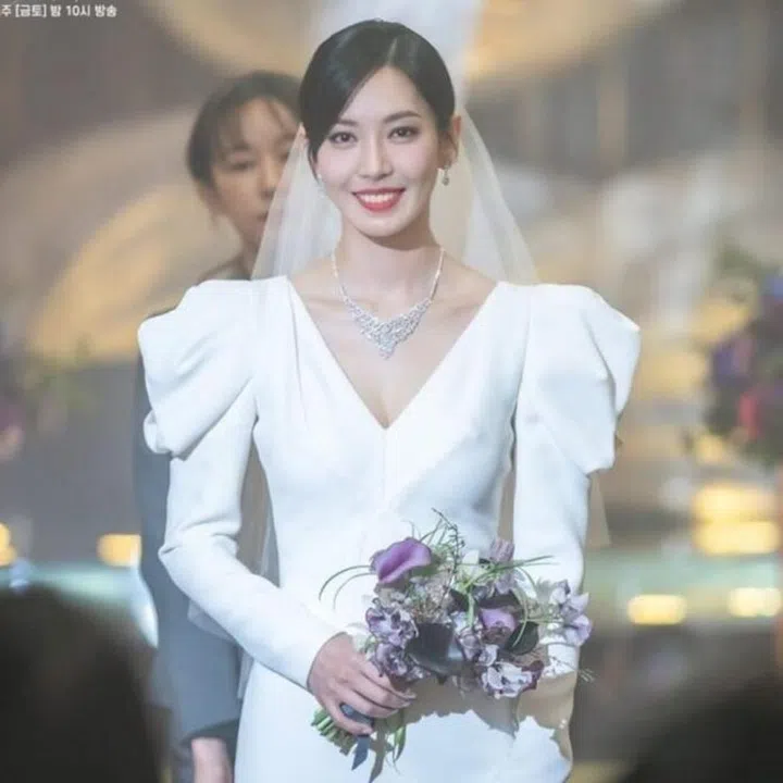 Season 2 saw the rise of Kim So-yeon as the head of Hera Palace. At her wedding, she wore a puff sleeve dress from Pronovias.