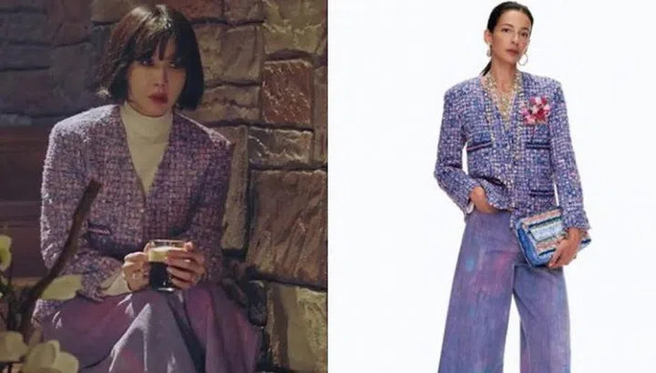Showing off her versatility in colour palette, Lee Ji-ah wore a purple tweed jacket and casual wide-legged trousers from Chanel spring/summer 2021.