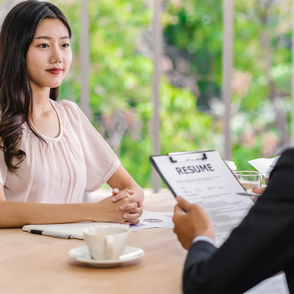 When you sit, position yourself comfortably - not too near or far from the table. Avoid slouching, have both feet on the ground, and maintain eye contact. Career coaches also advise job seekers to keep their hands on the table or on their laps, so they do not make large gestures.