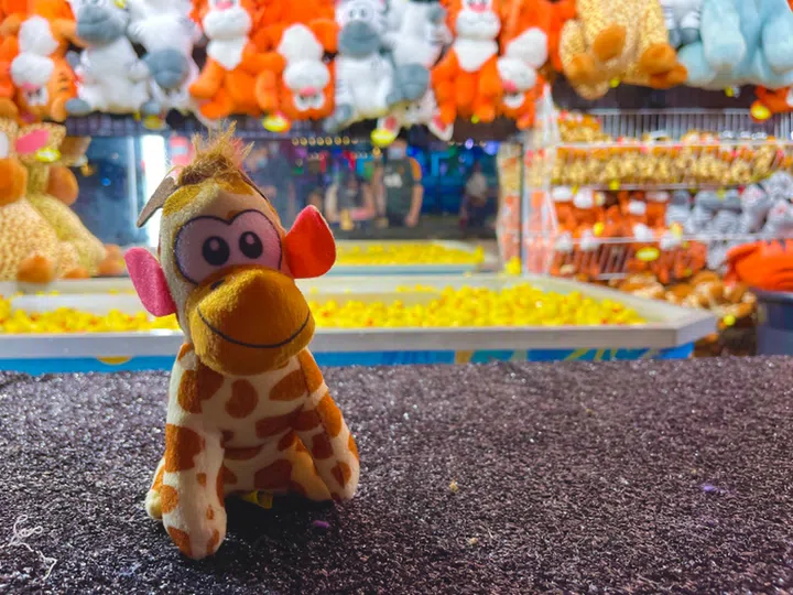 The only game where we did get a prize was a play-to-win game. We scooped two rubber ducks from a vortex of toys and received a little giraffe. If you are luckier than us, you can get bigger soft toys.