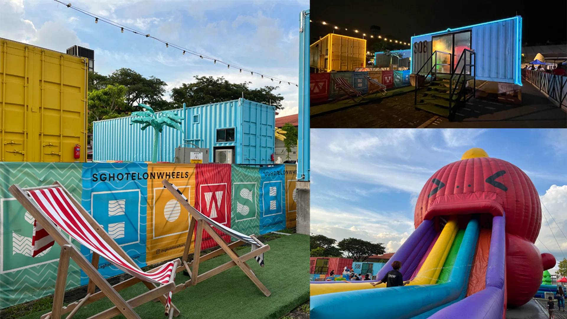 Here comes the fun part. The container hotel is situated next to a carnival and has large bouncy castles, a big Octopus water slide, and games to play. During the evening, there were actually more people than we were expecting, with groups of friends, couples, and families all having fun.