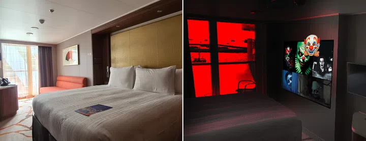 The stateroom and Halloween-themed rooms