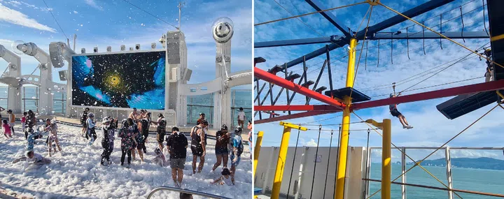 If you're on the search for non-creepy adventures, there's a seemingly endless list of things to do while you're on board. The sporty and adventurous can strap on their safety harnesses and get on the rope course, before whooshing down the 35m zipline, right above open water. (PSA: wear covered shoes and for those with long hair, your hair will need to be tied back).