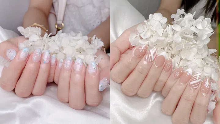 Want to rock nails that are both chic and elegant? Fifty; Freed Beauty Bar's Christmas designs are simple but gorgeous. The first design is reminiscent of bridal nails - with a nude base and white details, this style will match any outfit you choose for your Christmas party.