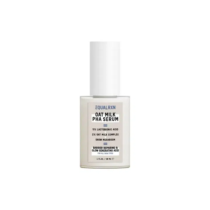 The product that landed EqualRXN on people’s radar is its viral Oat Milk PHA Serum – if you’re wondering what the PHA stands for, it’s polyhydroxy acid – the latest generation of acid exfoliants. They have similar benefits to the more well-known AHAs (alpha-hydroxy acids) like glycolic acid – such as removing dead skin cells for (temporarily) smoother and brighter skin – but with one major advantage: they’re far more gentle than their more famous predecessors.