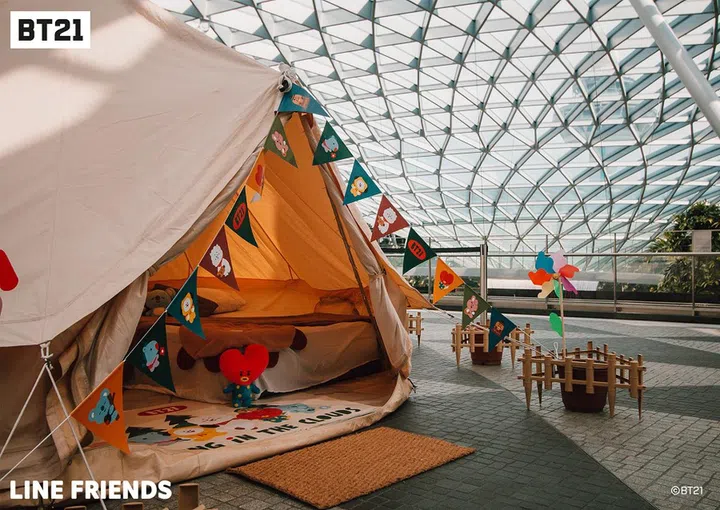 There's more. Snuggle within BT21-themed glamping tents at Cloud9 Piazza, located at Jewel Changi's topmost level and overlooking the HSBC Rain Vortex. Each BT21-themed tent accommodates up to four guests and the glampcation package also comes with two exclusively designed BT21 t-shirts as well as tickets to selected Jewel attractions.