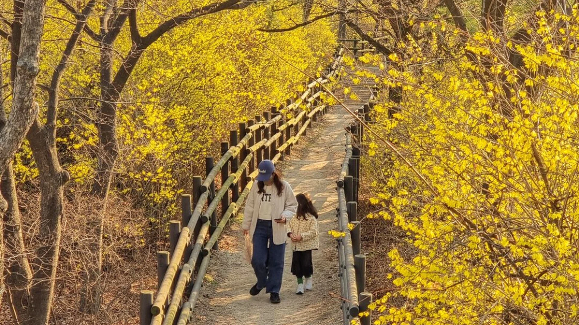 Eungbongsan Mountain in Seoul’s Seongdong district is one of the best places to view these yellow flowers, a native plant in Korea. You can hike up for about 30 minutes to enjoy the view of the Han River and the cityscape. There’s a pagoda-style pavilion that hosts events like the annual Forsythia Festival.