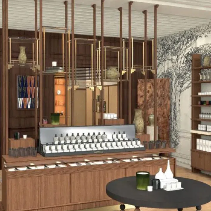 The second outpost of French fragrance brand Diptyque will make you feel at home, literally. Designed as a home away from the Parisian brand’s home, the store is a harmonious blend of cultural influences. A central fireplace and mouldings typical of French apartments are juxtaposed with “colonial-style” touches such as a wood-and-glass furniture unit, rattan panelling and wooden openwork ceiling. Some furniture pieces designed by Singapore-based Studio Kallang make an appearance too. Styled to resemble a vast apartment, the space is sectioned into rooms for customers to meander through and discover the various Diptyque ranges. At the entrance, a wooden console displays the brand’s popular collection of perfumes in signature oval bottles. One of the coloured wall niches holds the Art du Soin collection for the body, available in a palette of textures that range from oils and solids to foams and balms. The space gets cosier as you venture in, furnished with rugs and vases, a boucle-upholstered sofa, and bookcases of scented candles. Fans can also find the brand’s wide range of home scents and decorative accessories that include candlesticks, diffusers, paperweights and lanterns for enhancing candle flames.