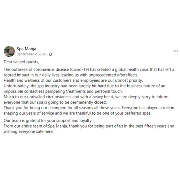 Unfortunately, they will now have one less place to visit as popular massage spot Spa Manjal, which has been around for over 15 years, has closed for good. In a Facebook post, the establishment shared that the industry hit hard by the pandemic due to the nature of their business.