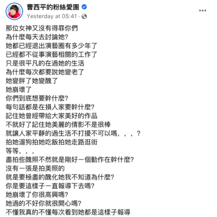"She has already retired for so many years and has nothing to do with the showbiz industry. She's just living her life. Why do people have to call her old, fat and ugly? What do you all want?"