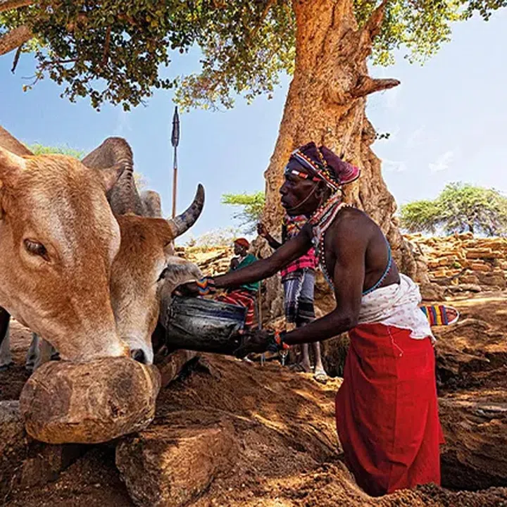 “There is a ceremony called ‘singing wells’ which is unique to this part of Kenya where during a drought, they dig a few metres into the ground to get water. The warriors collect buckets of water and send them up to the surface to fill a trough. Then each warrior sings a personal song to call his cow to the water and pacify her. It is magical,” says Cohen.